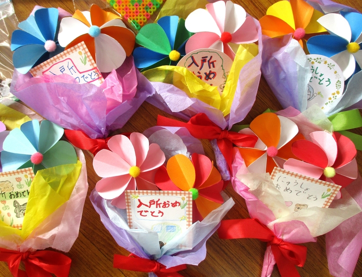 自己紹介の後は、新入所生へ在所生から花束とアイロンビーズのマグネットをプレゼントしました。