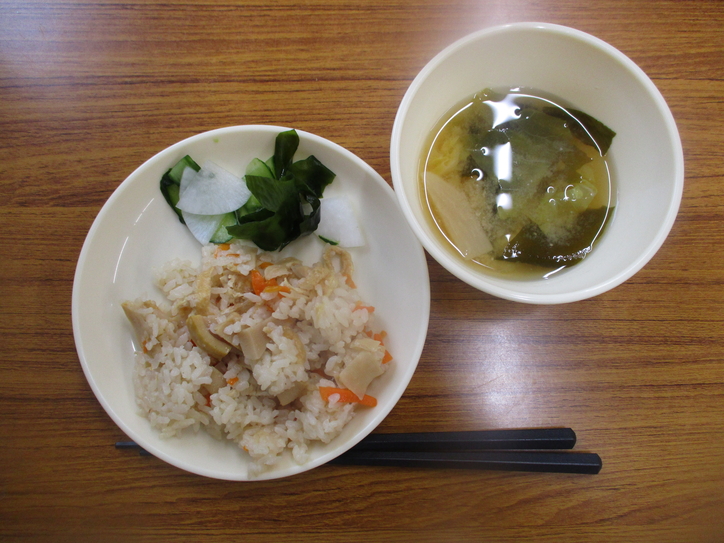 今回の手作りおやつは筍ご飯・浅漬け(わかめ、大根、きゅうり)・みそ汁(キャベツ、大根、わかめ)でした!